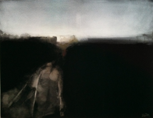 A legutóbbi képpel furcsán jártam, nagyjából azt hittem, hogy készen van, aztán gyorsan lefotóztam a telefonommal, hogy vacsoránál megmutathassam szeretteimnek, és rémülten láttam, hogy amit én útnak szántam festeni, az egy fejetlen emberi figurának látszik a fotón. Így nézett ki: